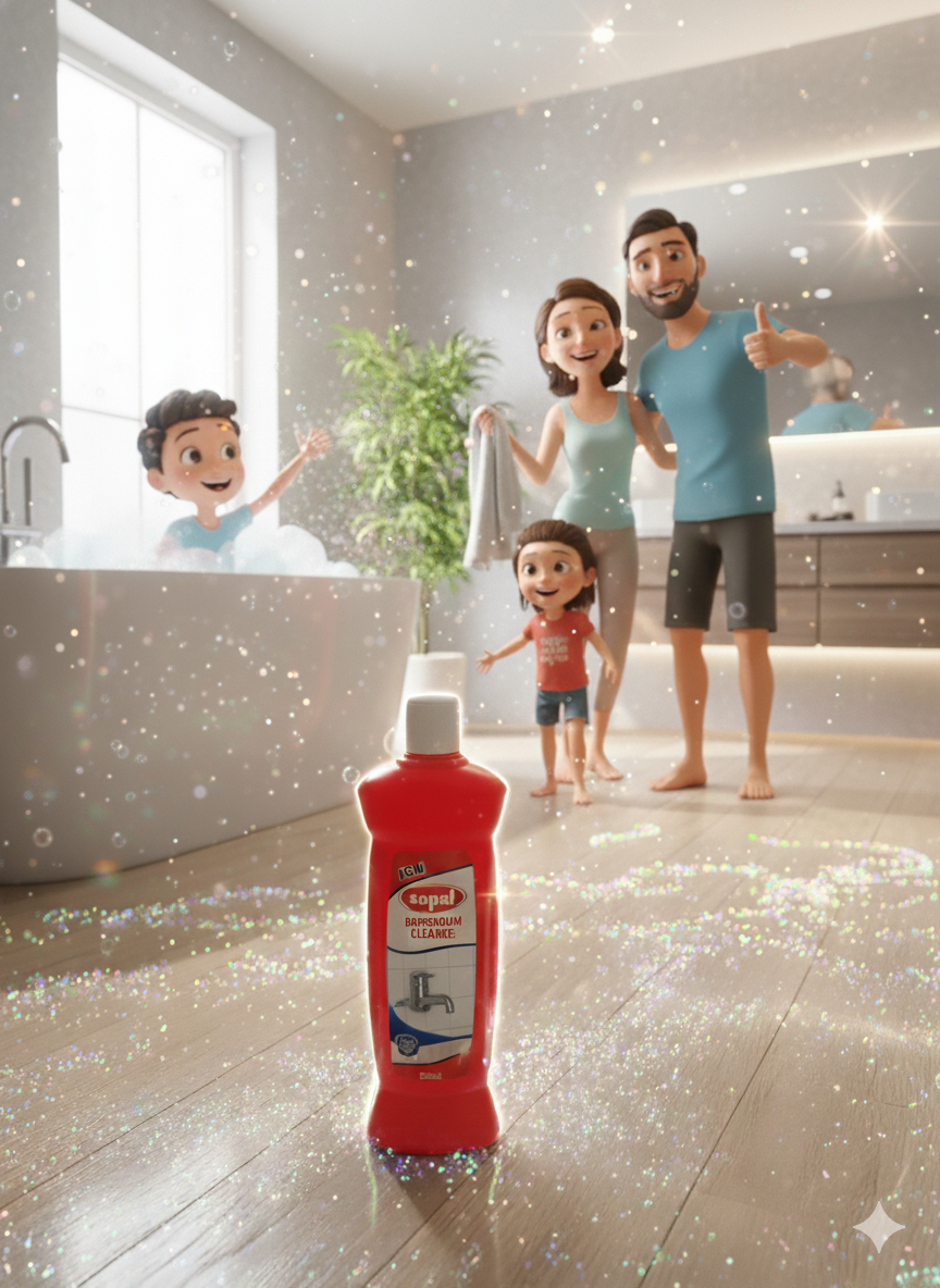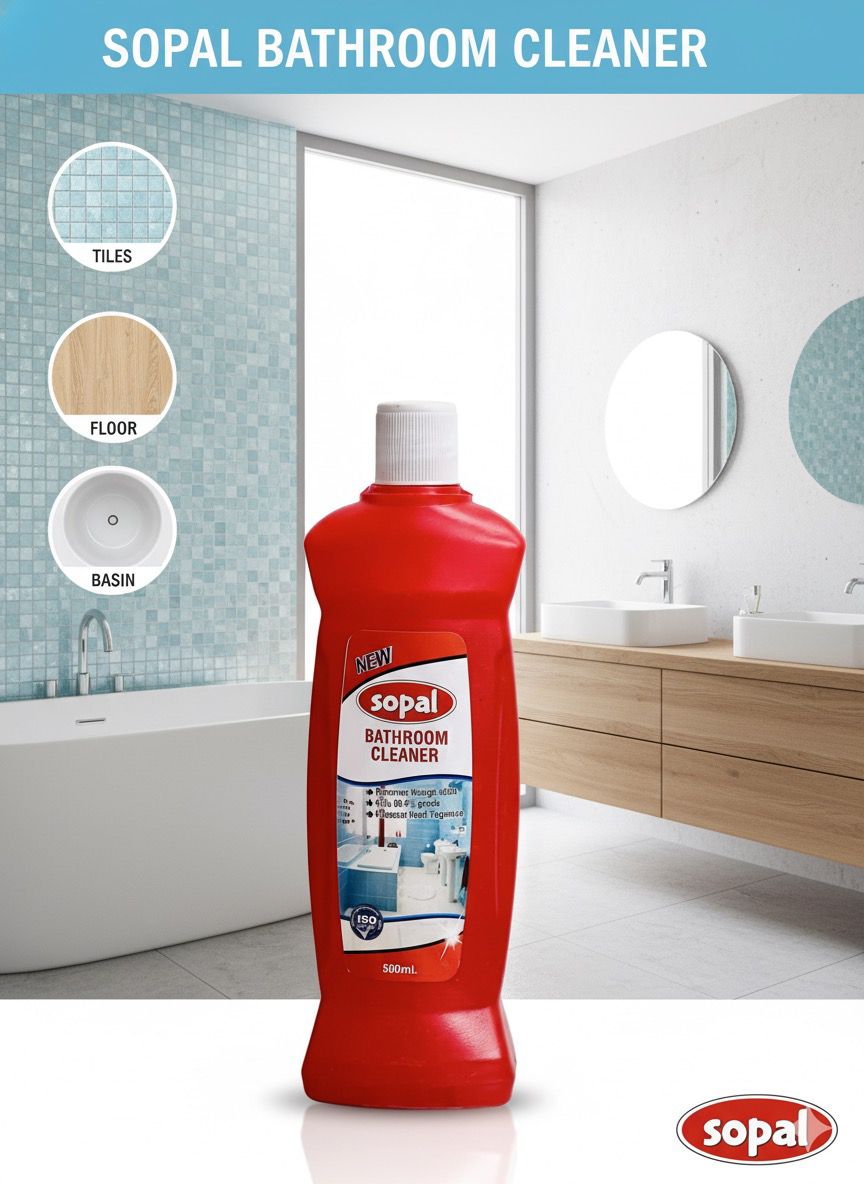 Sopal Bathroom Cleaner – 500ml Keep your bathroom sparkling clean with Sopal’s powerful NEW formula. Removes tough stains, kills 99.9% germs, and eliminates odors from tiles, toilets, sinks, and floors. Pleasant fragrance leaves bathrooms fresh. Easy-to-use bottle for effective cleaning. ISO 9001:2015 certified hygiene protection for healthy homes. Net Vol: 500ml | Made in India