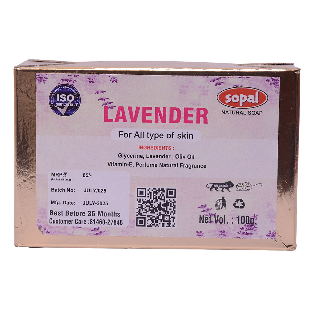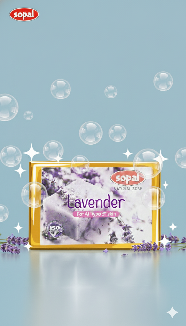 Sopal Lavender Natural Soap – 100g Unwind with Sopal’s Lavender Soap, infused with pure lavender extract for ultimate relaxation. Enriched with glycerine, olive oil, and Vitamin-E, it gently cleanses while calming your mind and soothing skin. Perfect for stress relief, better sleep, and sensitive skin. ISO certified aromatherapy luxury.
